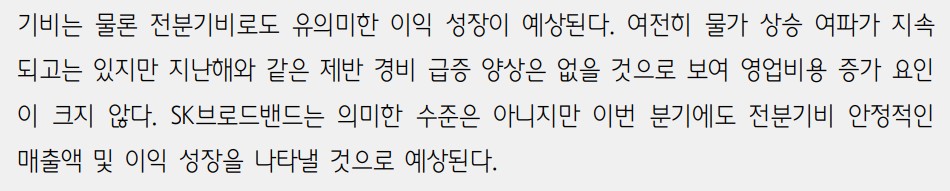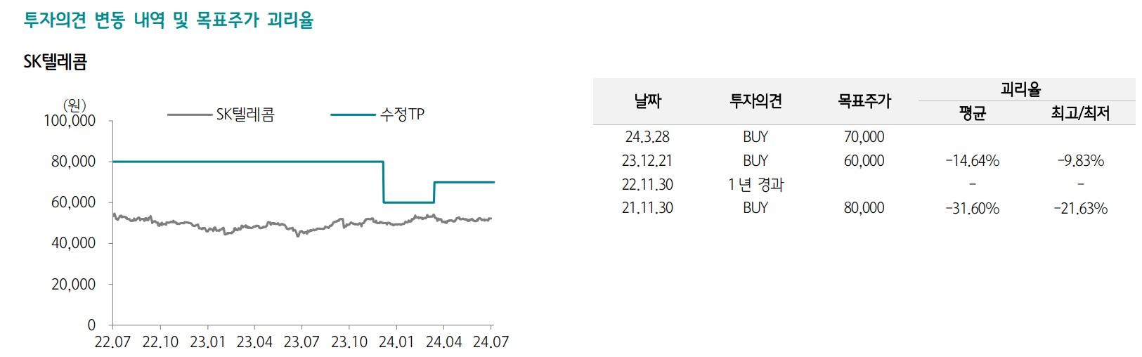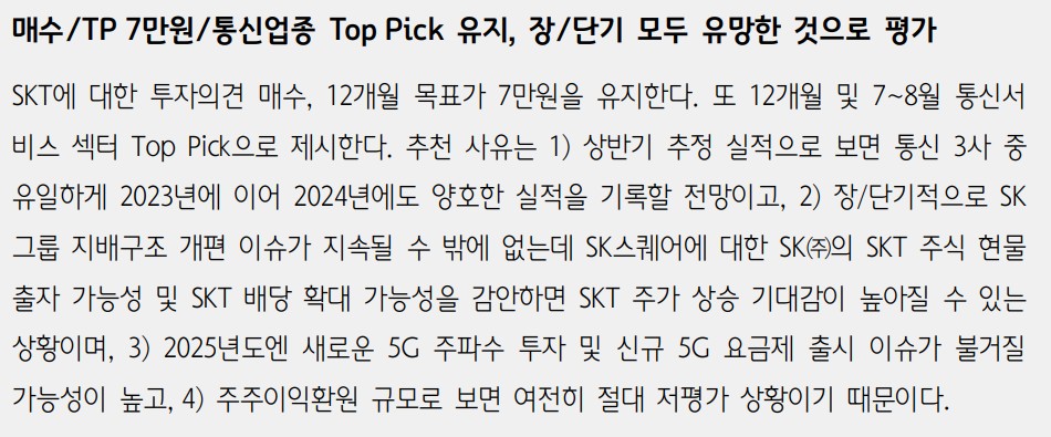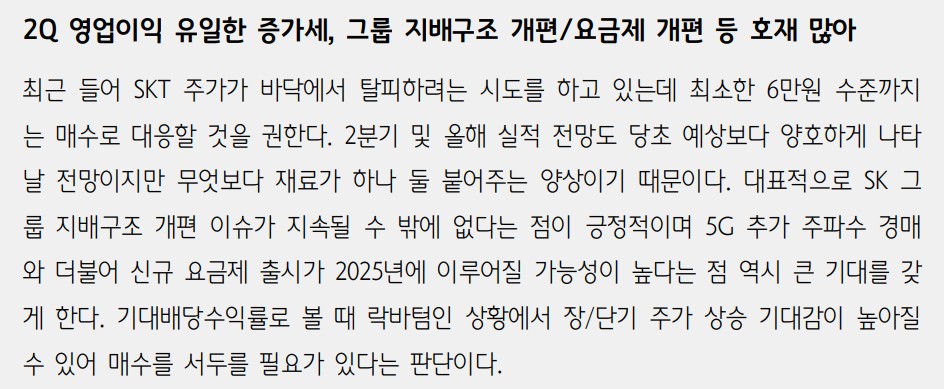 SK텔레콤은 2024년 2분기에 양호한 실적을 기록하며 주가 상승 기대감을 높이고 있음. 5G 주파수 추가 투자와 신규 요금제 출시, SK그룹 지배구조 개편 등 여러 긍정적인 이슈가 주가에 긍정적으로 작용할 것으로 보임. 따라서 장기적인 관점에서 SK텔레콤에 대한 투자는 유망할 것으로 판단됨.