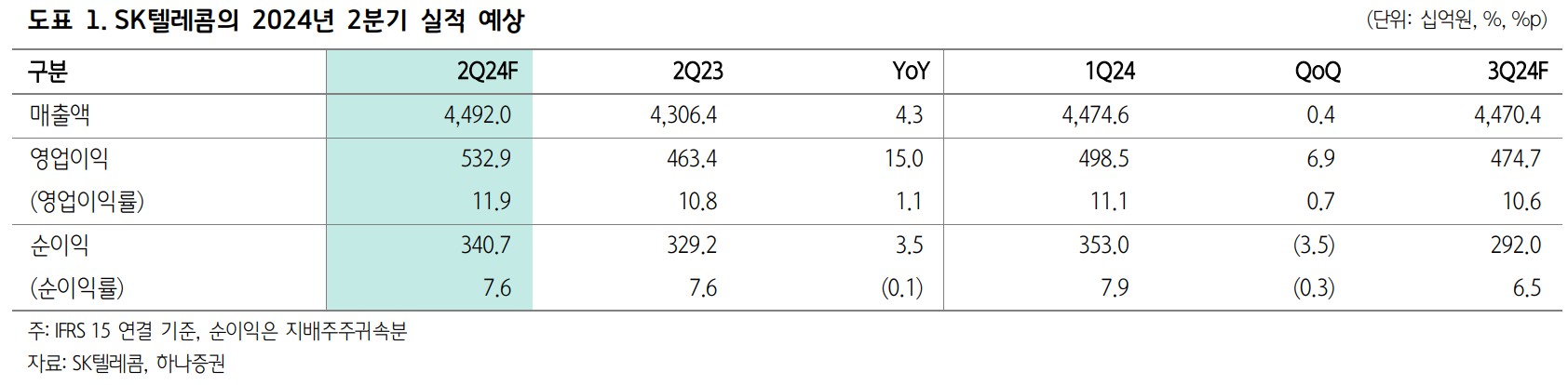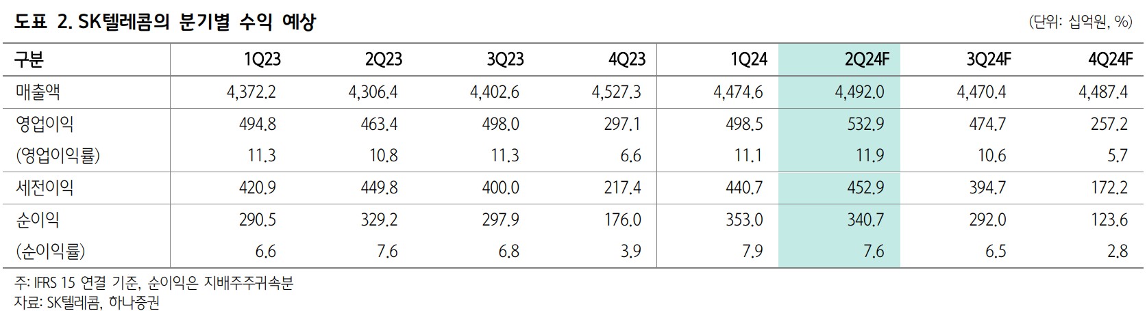A. SK텔레콤은 2024년 2분기 양호한 실적과 5G 주파수 추가 투자, 신규 요금제 출시 등의 이슈로 주가 상승 가능성이 큼.