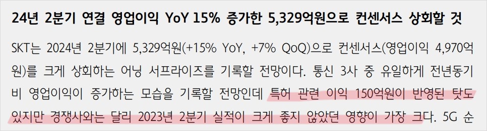 SK텔레콤은 2024년 2분기에 영업이익 5,329억원을 기록하면서 전년 대비 15% 증가한 실적을 보임. 이는 시장 예상치를 상회하는 어닝 서프라이즈임. 통신 3사 중 유일하게 실적이 증가했으며, 이는 특허 관련 이익 150억원이 반영된 덕분. 5G 순증 가입자수 급감에도 불구하고 이동전화 매출액은 정체됨. 하지만 유형자산 CAPEX 감소와 마케팅비용 하향 안정화로 인해 전년 및 전분기 대비 이익 성장이 예상됨. SK브로드밴드도 안정적인 매출액 및 이익 성장을 나타낼 것으로 보임. SK텔레콤은 2024년에도 양호한 실적을 기록할 전망이며, 장/단기적으로 SK그룹 지배구조 개편 이슈 및 배당 확대 가능성으로 주가 상승 기대감이 높아질 것으로 보임.