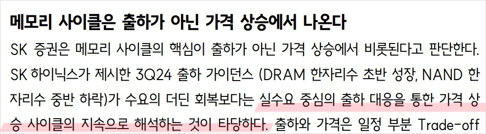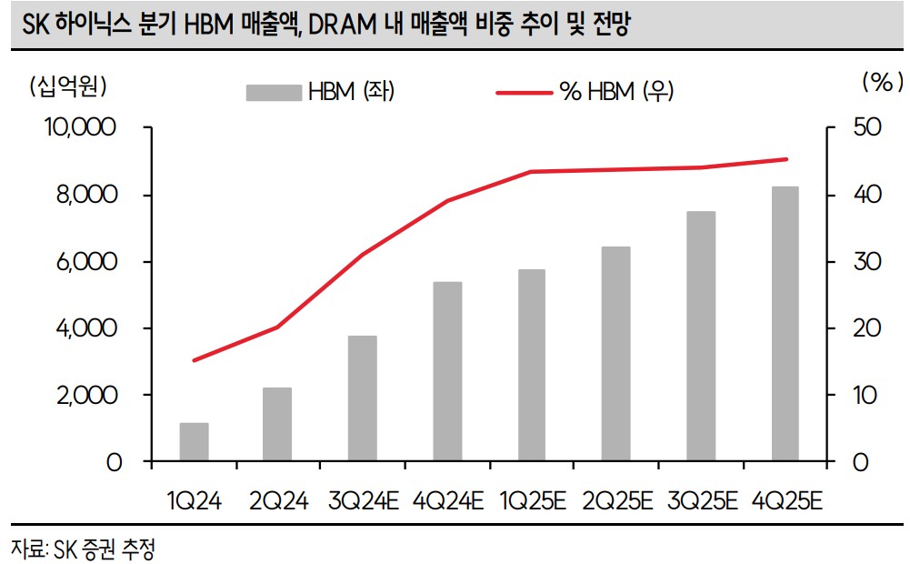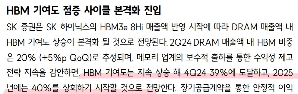 최근 SK하이닉스는 HBM3e 8Hi 제품의 판매가 시작되며, DRAM 매출 비중이 크게 증가함. 이에 따라 2024년 DRAM 매출의 20%가 HBM에서 발생할 것으로 전망됨. 또한, SK하이닉스는 메모리 시장에서의 보수적인 출하 정책을 통해 가격 상승 효과를 기대 중. 이러한 전략은 2025년에도 이어질 예정이며, 안정적인 수익 기반을 다지는데 중요한 역할을 할 것으로 보임.