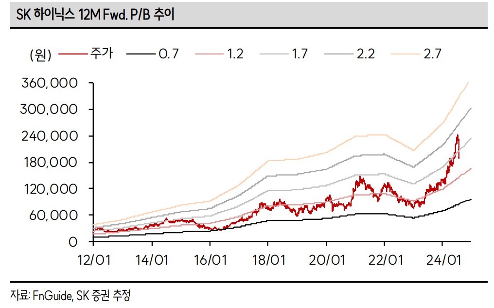 SK하이닉스의 주가는 메모리 시장의 회복과 함께 상승할 가능성이 큼. 특히, HBM 제품의 수요 증가와 AI 서버 시장의 확장은 주가에 긍정적인 영향을 미칠 것으로 예상됨. 2024년 말까지 SK하이닉스의 목표 주가는 340,000원으로 설정됨. 이 목표 주가는 현재 주가 대비 약 77% 상승 여력을 보여줌.