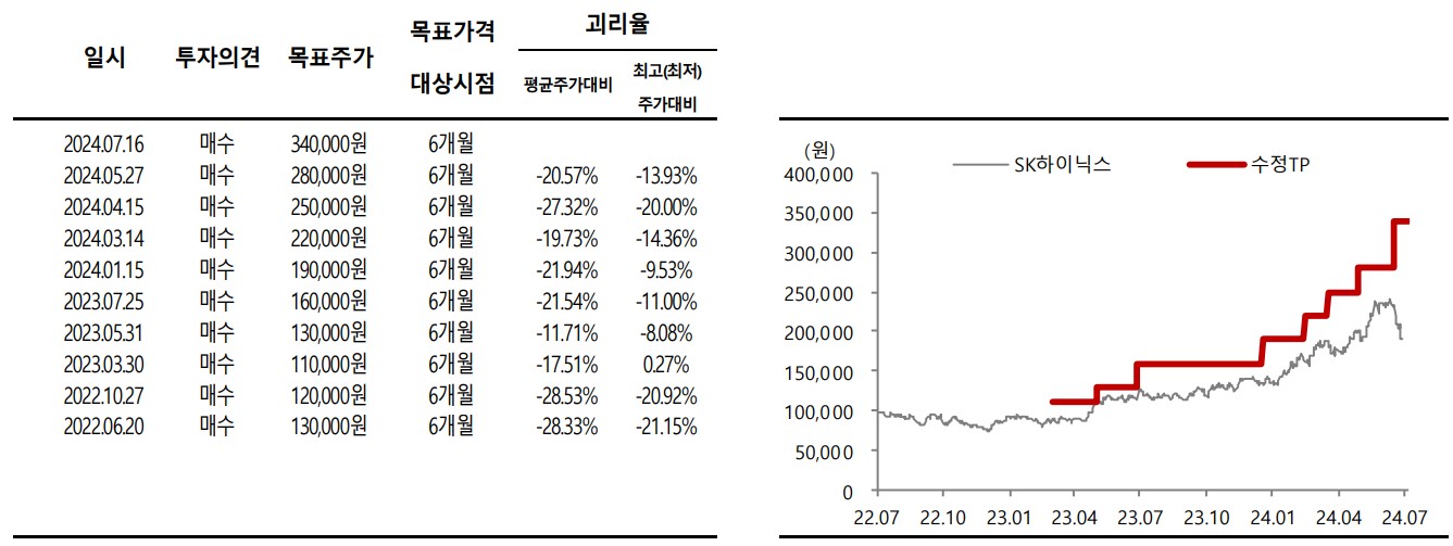 SK증권에서는 SK하이닉스의 목표주가를 340,000원으로 설정했음. 이는 현재 주가 대비 약 77.3%의 상승 여력이 있음을 나타냄. HBM 제품의 매출 비중 증가와 함께, 메모리 시장의 회복이 예상되며, 이에 따른 주가 상승이 기대됨.