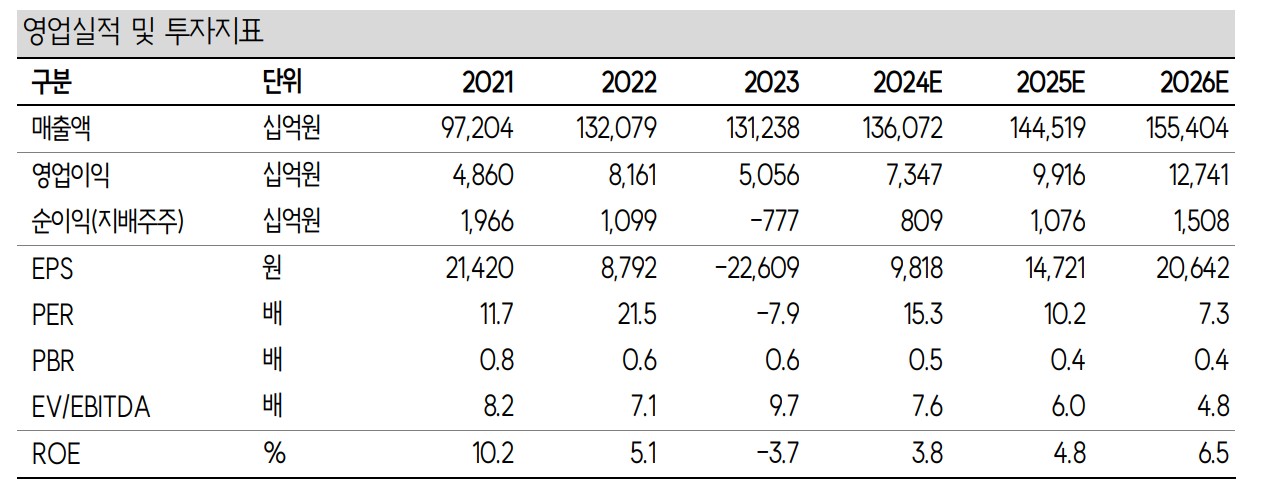 SK의 재무 상황은 지속적으로 개선되고 있음. 2023년 매출액은 131,238억 원, 영업이익은 5,056억 원으로 기록되었으며, 2024년에는 매출액 136,072억 원, 영업이익 7,347억 원을 예상함. 부채비율은 165.8%로 양호한 수준을 유지하고 있으며, PER은 15.3배로 평가됨. 이는 SK의 재무 안정성과 성장 가능성을 잘 나타내줌.
