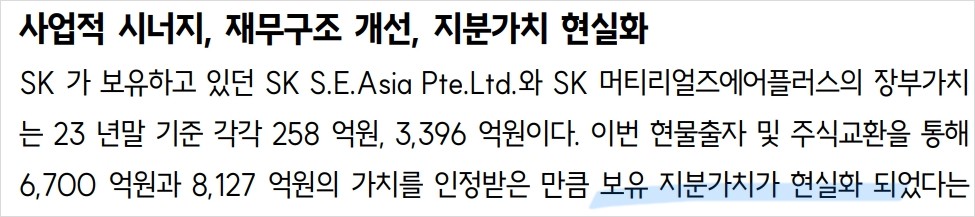 SK는 최근 SK에코플랜트의 유상증자와 SK머티리얼즈에어플러스의 주식교환을 통해 재무 구조를 개선하고 사업적 시너지를 기대할 수 있게 되었음. (개인주주는 똥이지만) 2023년 말 기준 SK는 SK에코플랜트 지분율을 41.8%에서 61.7%로 높였고, 이는 SK에코플랜트의 재무 안정성을 높이는 데 기여했음. 또한, SK S.E.Asia Pte.Ltd.와 SK머티리얼즈에어플러스의 지분가치 현실화를 통해 SK의 보유 자산 가치를 증대시켰음.
