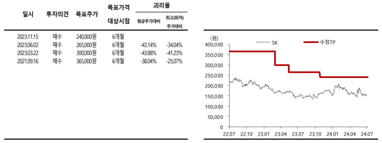 A. SK의 목표 주가는 240,000원으로 제시되었으며, 이는 현재 주가 대비 약 60%의 상승 여력을 의미합니다.