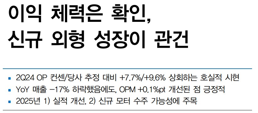 SNT모티브는 2024년 2분기 실적에서 영업이익 251억 원으로 컨센서스와 당사 추정을 각각 7.7%, 9.6% 상회하는 성과를 기록했음. 특히, 매출액이 전년 동기 대비 17% 감소했음에도 불구하고, 영업이익률(OPM)이 0.1%p 개선된 점이 긍정적으로 평가됨. 또한, 방산 부문에서의 안정적인 매출 기여로 전체 실적이 견조하게 유지되고 있음. 현재 SNT모티브는 지속적인 외형 성장보다는 이익 체력 강화에 주력하고 있음.