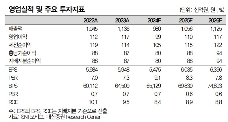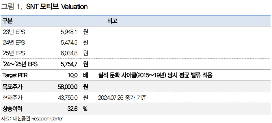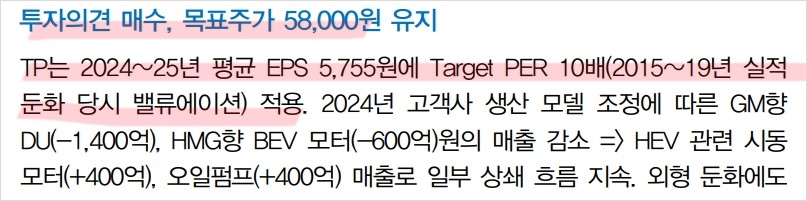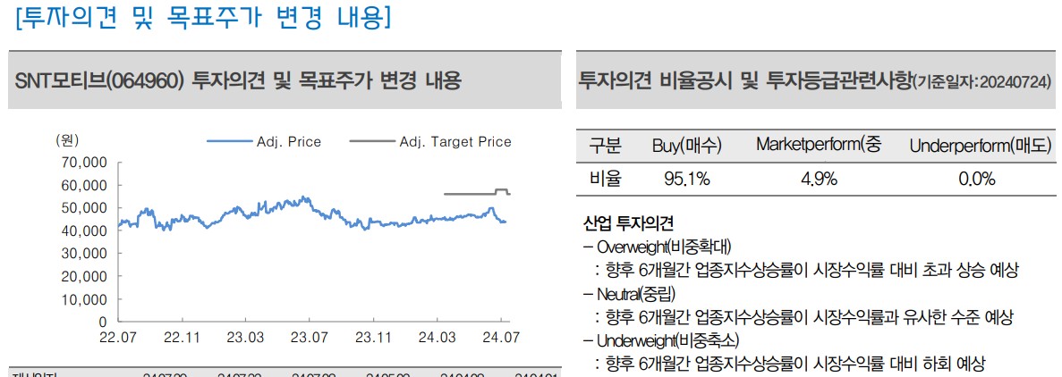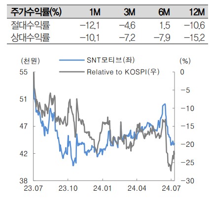 SNT모티브의 주가는 2025년을 기점으로 개선될 가능성이 있음. 신규 모터 수주와 함께 전기차 시장의 성숙으로 인한 수익성 개선이 예상됨. 현재 목표 주가는 58,000원으로 설정되어 있으며, 이는 현재 주가 대비 32.6% 상승 여력이 있음. 따라서, 단기적으로도 투자 매력이 높다고 판단됨.