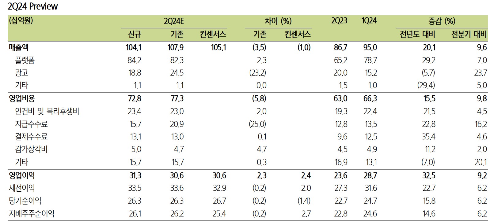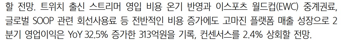 SOOP의 2분기 영업이익은 313억원으로, 전년 동기 대비 33% 증가할 전망임. 별풍선 매출의 고성장이 지속되며, 2분기 플랫폼 매출은 YoY 29% 증가할 것으로 예상됨. 광고 매출은 인기 게임 리그 종료 영향으로 감소했으나, 플랫폼 매출 성장으로 전체 매출은 YoY 20.1% 증가할 전망. 글로벌 SOOP은 현재 기술 테스트 중이며, 25년부터 본격적인 마케팅으로 이용자 확대가 기대됨.