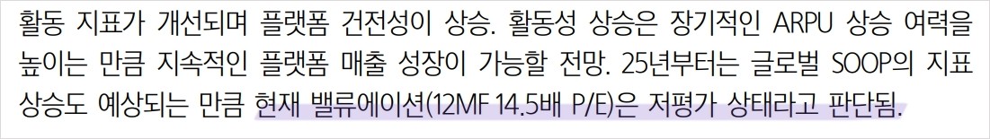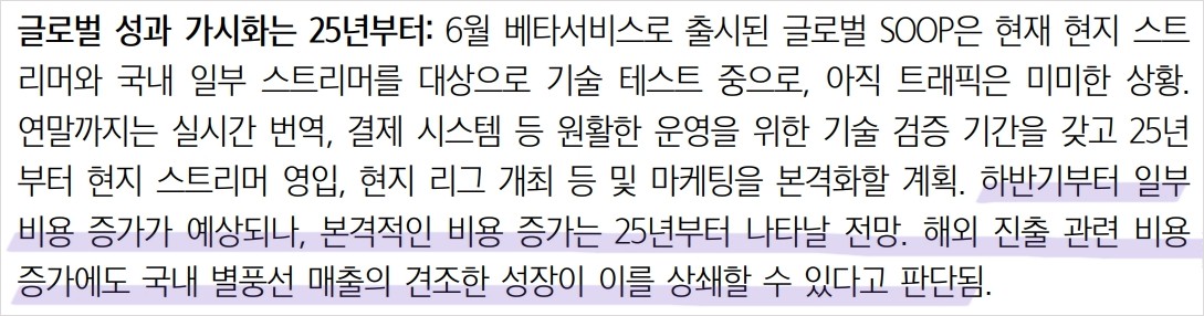 SOOP은 최근 다양한 신규수주와 기술 테스트를 통해 성장세를 보이고 있음. 별풍선 매출은 상위 BJ를 중심으로 고성장을 지속하며, 플랫폼 매출 증가에 기여하고 있음. 광고 매출은 일부 감소했으나, 플랫폼 매출 성장으로 전체 매출은 YoY 20.1% 증가할 것으로 예상됨. 글로벌 SOOP은 현재 현지 스트리머와 국내 일부 스트리머를 대상으로 기술 테스트 중이며, 25년부터 본격적인 마케팅과 현지 리그 개최가 예정되어 있음.