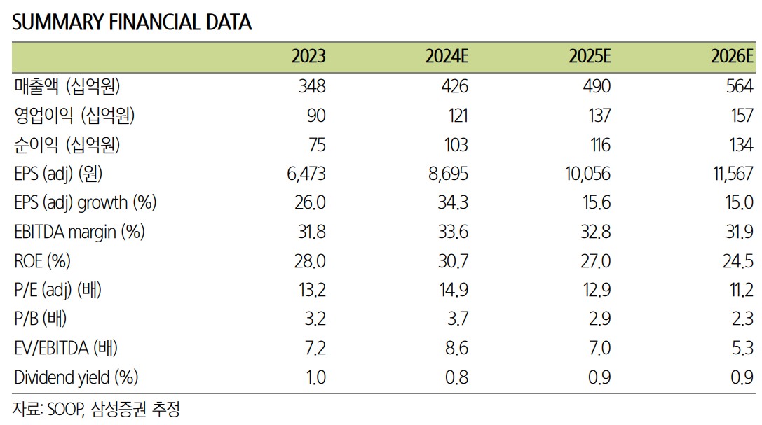 SOOP의 재무상태는 전반적으로 안정적임. 2023년 매출액은 348억 원, 영업이익은 90억 원을 기록하였으며, 2024년에는 매출액 426억 원, 영업이익 121억 원으로 증가할 전망임. 주가 또한 안정적으로 상승 중이며, 목표 주가는 160,000원으로 제시됨.