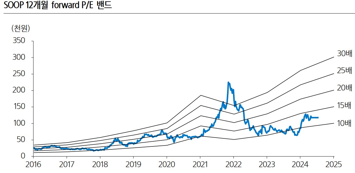 SOOP의 주가는 앞으로도 긍정적인 흐름을 보일 것으로 예상됨. 별풍선 매출의 고성장과 글로벌 SOOP의 본격적인 마케팅으로 인해 주가 상승 가능성이 높음. 목표 주가는 160,000원으로 제시됨.