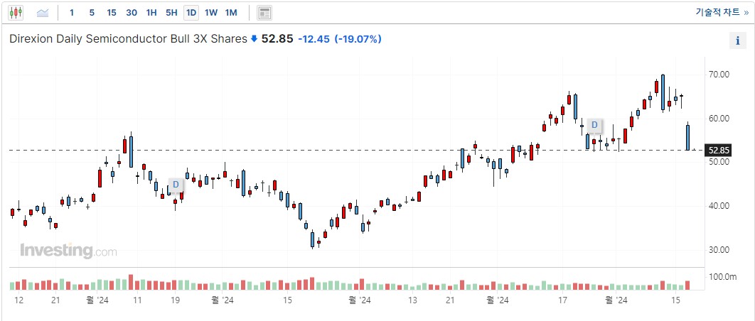 이 글을 쓰고 있는 한국시간 2024년 7월 18일 오전 4시 기준으로 SOXL 주가는 장대음봉을 그리면서 약 -19%의 폭락을 보여주고 있습니다. 언론에 나온 주가 하락 이유는 2가지 입니다. (이미지는 눌러서 보시면 크게 보실 수 있어요)