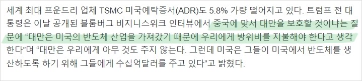 - 트럼프 대통령이 대만 반도체 TSMC와 대만 방위에 대해 불평을 함