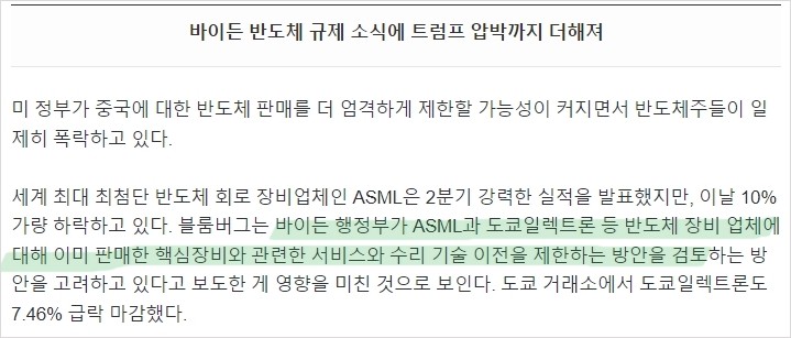 💊 바이든 행정부가 ASML과 도쿄일렉트론 등 반도체 장비 업체에 대해 중국에게 판매한 핵심 장비 + 서비스 + 수리기술 이전 제한을 검토하고 있다.