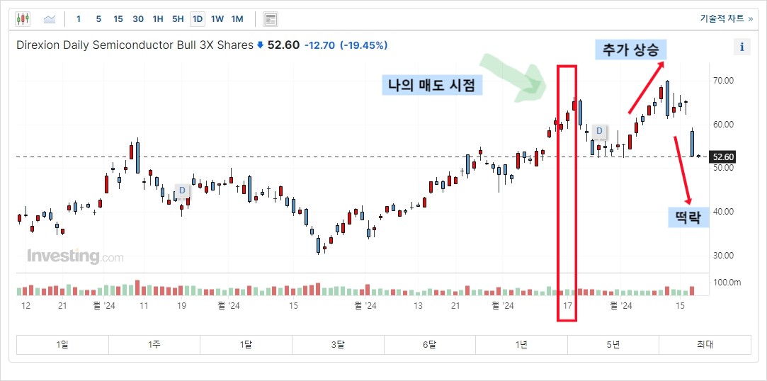 먼저 제가 SOXL 주식을 매도한 이유부터 설명드릴게요. 이게 SOXL폭락 이유와 겹치거든요. 저는 SOXL을 2024년 6월 17일 약 60달러 가격에 매도했습니다. 당시에는 제가 매도한 가격보다 더 오르는 바람에 '조금만 더 참을걸!! 내 돈!' 이러면서 배 아파하기도 했었죠. 언제나 수익은 옳다면서 스스로를 위안했습니다. 그럼에도 다시 매수하지는 않았는데 왜일까요?