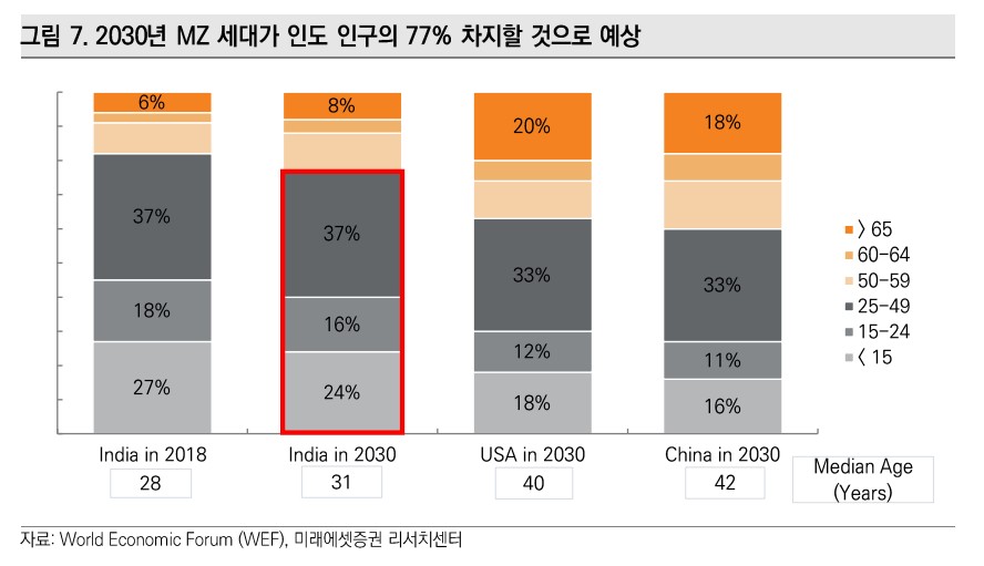 미래에셋증권이 TIGER인도빌리언컨슈머ETF를 만든 이유도 이거임. 얘네가 보니까 미쳤다 이거야. 2030년이 되면 무려 77%%가 MZ세대라니까? 로인이 없어요 로인이!! 한국은 노인의 나라가 되는데 인도는 청년들의 나라가 된다 이거야!!?