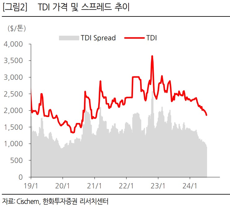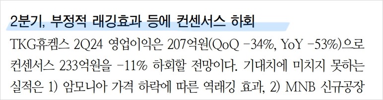최근 TKG휴켐스의 영업 실적은 예상보다 저조했음. 암모니아 가격 하락과 MNB 신규 공장 가동에 따른 감가상각비 증가 등이 주요 원인임. 그러나 하반기부터는 MNB 증설 효과가 본격적으로 반영될 것으로 기대됨.