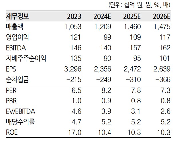 TKG휴켐스의 최근 재무 상황을 보면, 매출액과 영업이익이 꾸준히 상승 중임. 2023년 매출액은 1,053억 원, 2024년 예상 매출액은 1,209억 원임. 부채비율은 2023년 30.0%로 양호한 편임.