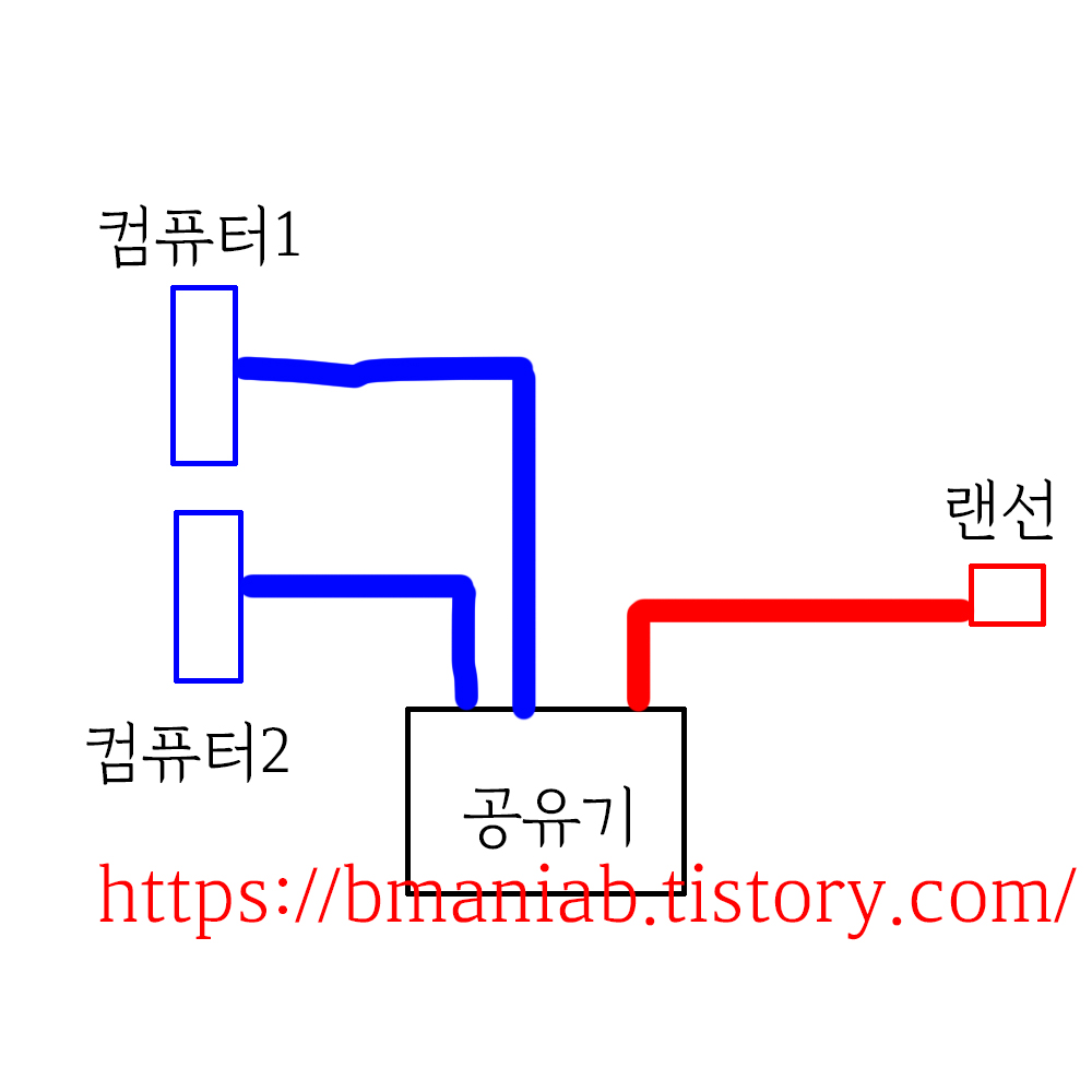 일단 공유기가 있어야겠죠? 그리고 랜케이블 1개 + 컴퓨터 숫자만큼의 랜케이블이 필요합니다. 컴퓨터도 랜선이 아닌 와이파이로 연결하려면 랜선이 필요 없으니까 노트북 같이 와이파이가 되는 분들은 랜 케이블 1개면 됩니다.